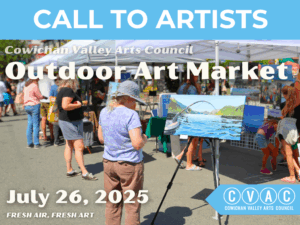 The Cowichan Valley Arts Council is holding an Outdoor Art Market in downtown Duncan on July 26, 2025 between 10:00 am and 4:30 pm.