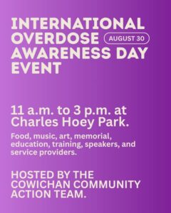 Overdose Awareness Day is happening August 30th from 11-3 at Charles Hoey Park, hosted by the Cowichan Community Action Team.